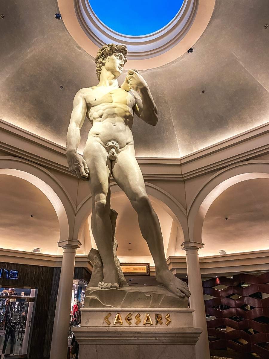 At Caesars Palace, you can find a replica of the world-famous Statue of David. The David statue is particularly impressive in that it is an exact copy, down to every detail, of the original statue carved by Michelangelo.